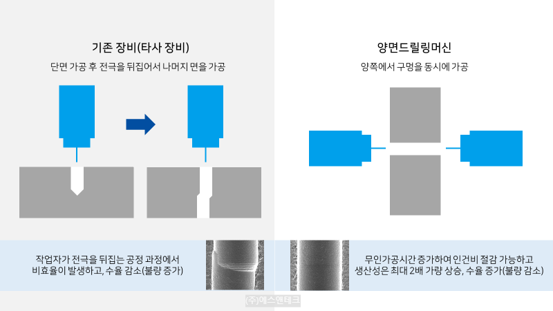 기존(타사) 장비들이 단면 가공 후 전극을 뒤집어서 나머지 면을 가공했던 것에 반해, 저희 장비는 양쪽 면에서 동시에 드릴링이 가능합니다. 이로서 작업자가 소재를 뒤집는 과정에서 발생할 수 있는 비효율이 줄어들고, 수율이 증가(불량 감소)하는 효과를 가져왔습니다.