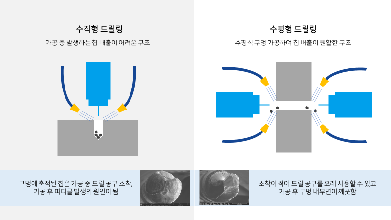 양면으로 가공하는 경우 드릴링 작업이 수평식으로 진행됩니다. 이 경우 가공 중 발생하는 칩 배출이 원활한 구조적 특성을 가집니다. 드릴 가공 중 구멍에 축적된 칩은 공구 소착, 파손 등의 원인이 되며, 최종적으로는 소재(전극)에 가공 품질에도 악영향을 미칠 수 있습니다. 수평형으로 양면에서 가공할 경우 가공 구멍내로 절삭유 공급이 원활하고, 드릴링 작업(step) 중 칩이 빠져나오기 용이합니다. 이로서 공구에 소착이 덜 발생하여 드릴 수명이 증가하고, 가공 후 구멍 내부면이 깨끗합니다.