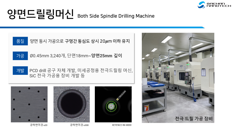(주)에스앤테크는 미세구멍 가공에 '양면드릴링머신(새한나노텍 제조)'을 사용하여, 효율적이고 정확한 가공이 가능하고 품질이 매우 우수합니다.